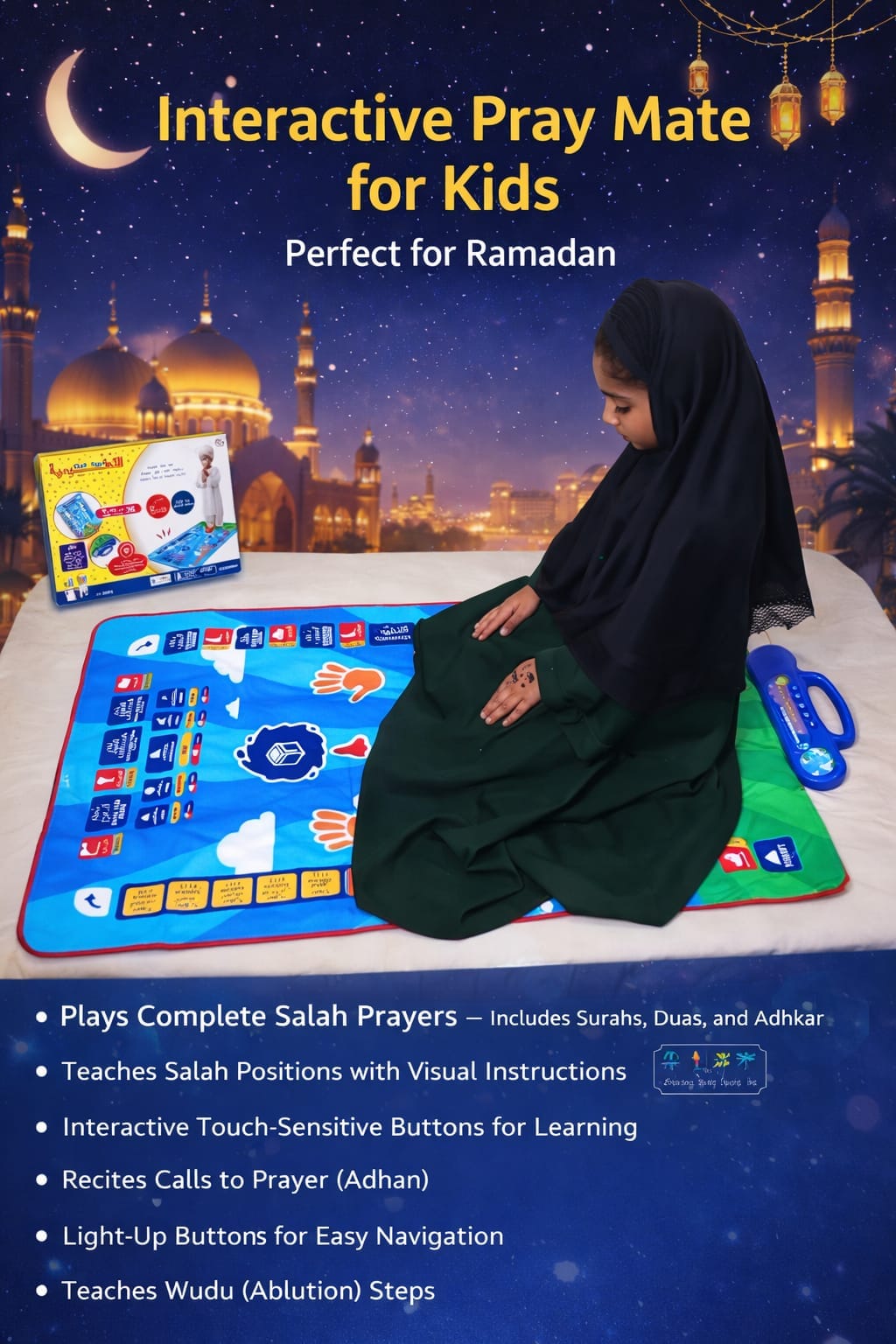 Realistic, touch-sensitive prayer mat that teaches kids Salah with sounds, instructions, and engaging interaction for fun learning.
