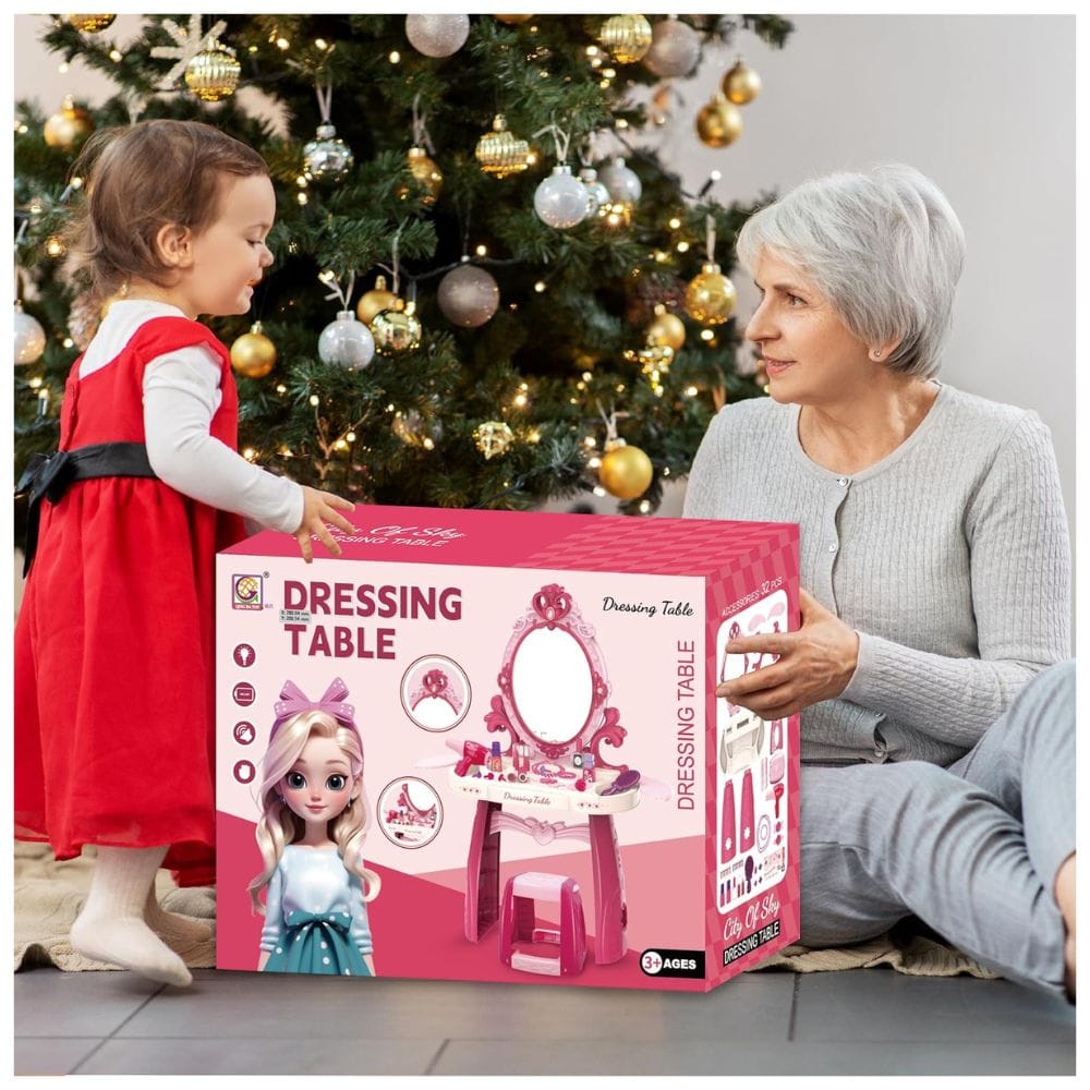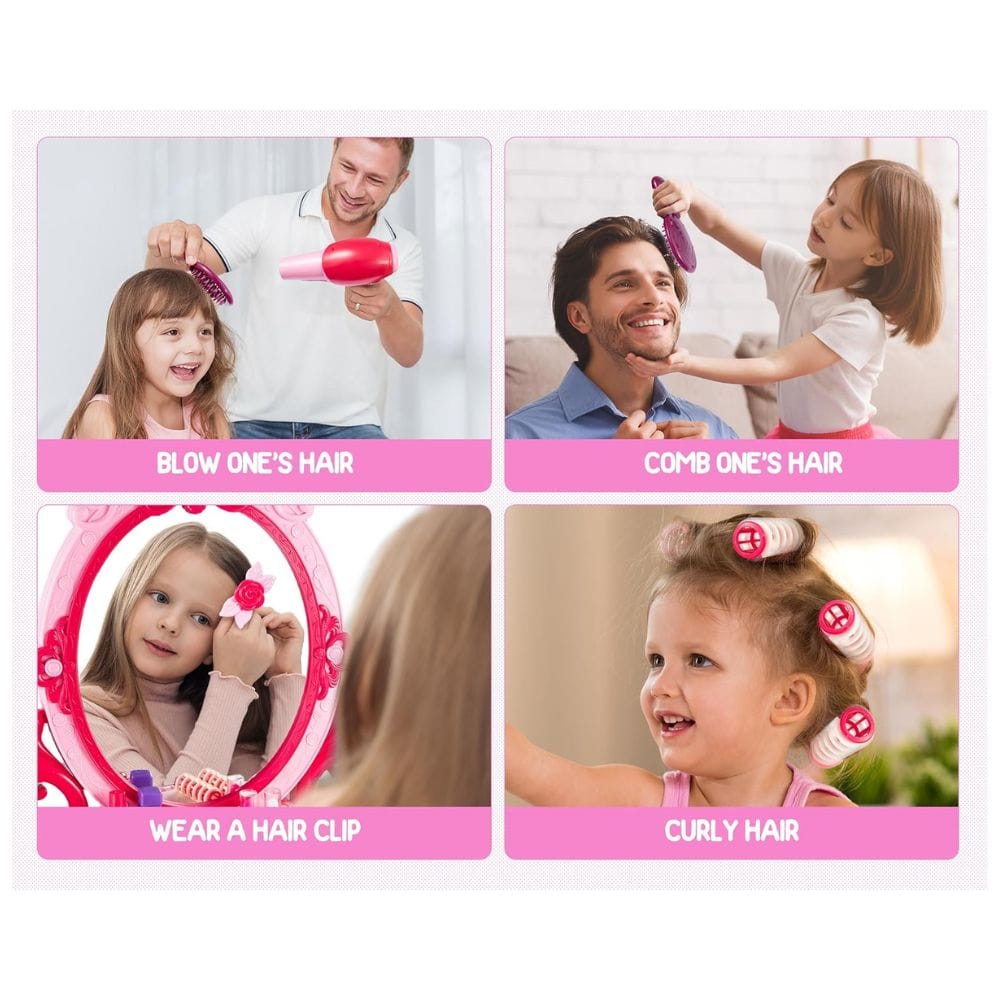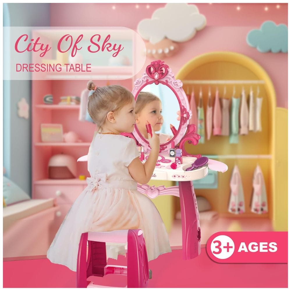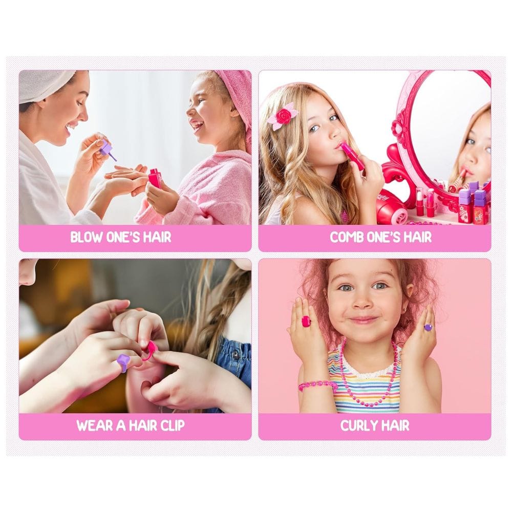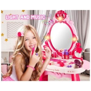 Adorable vanity table with mirror, lights, and music! Includes pretend makeup and hair dryer toy—perfect gift for girls ages 2–6 for fun role play.